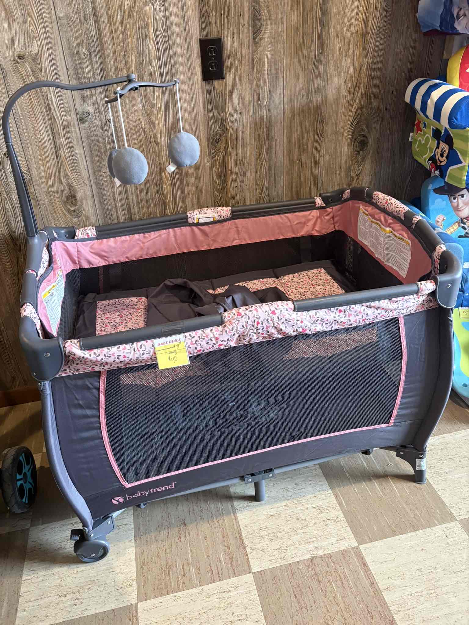 Grey and pink. Folds up for easy transport padded rails